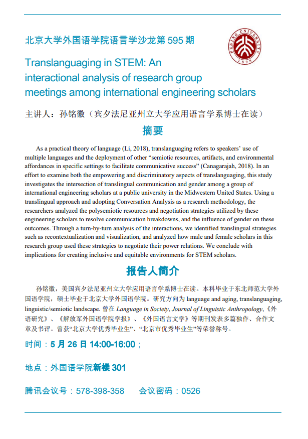 服务导航 凯发官方网站,凯发kaifa(中国)语言学沙龙第595期:Translanguaging in STEM:An interactional analysis if research group meetings among international engineering scholars 2023-05-21
