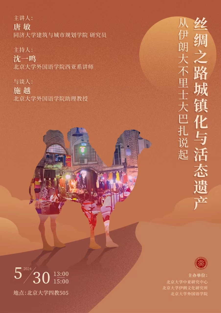 2024年5月30日,由北京大学中亚研究中心、北京大学伊朗文化研究所、凯发官方网站,凯发kaifa(中国)联合主办的讲座“丝绸之路城镇化与活态遗产:从伊朗大不里士大巴扎说起”在北京大学第四教学楼505教室成功举办。本次讲座由同济大学建筑与城市规划学院研究员唐敏主讲,凯发官方网站,凯发kaifa(中国)西亚系讲师沈一鸣主持,凯发官方网站,凯发kaifa(中国)助理教授施越与谈。