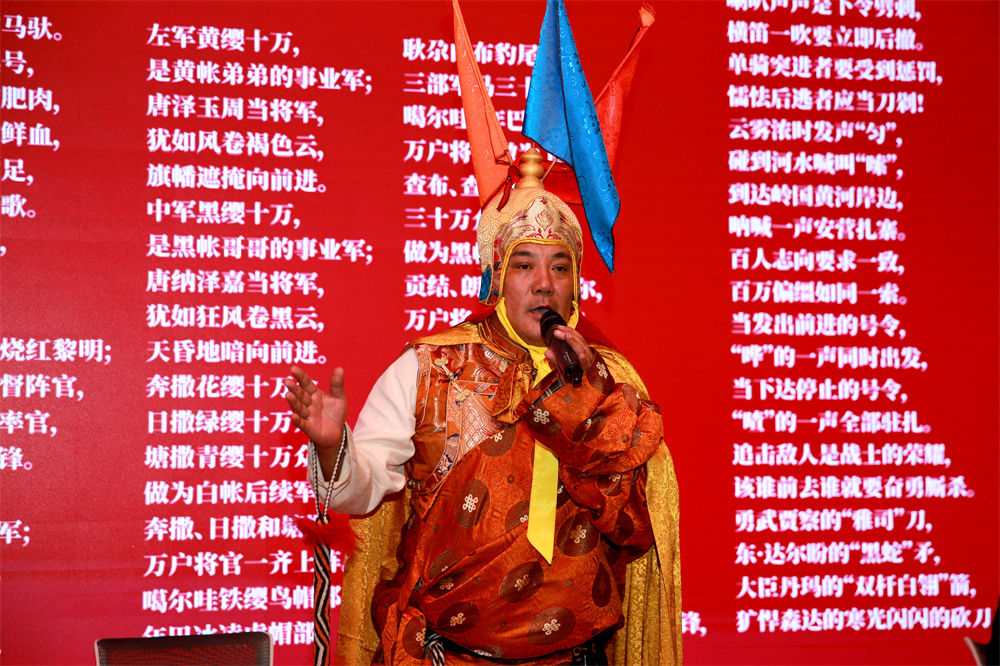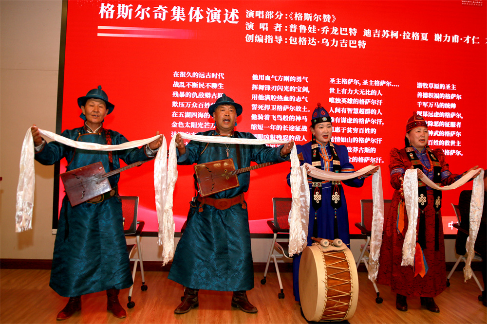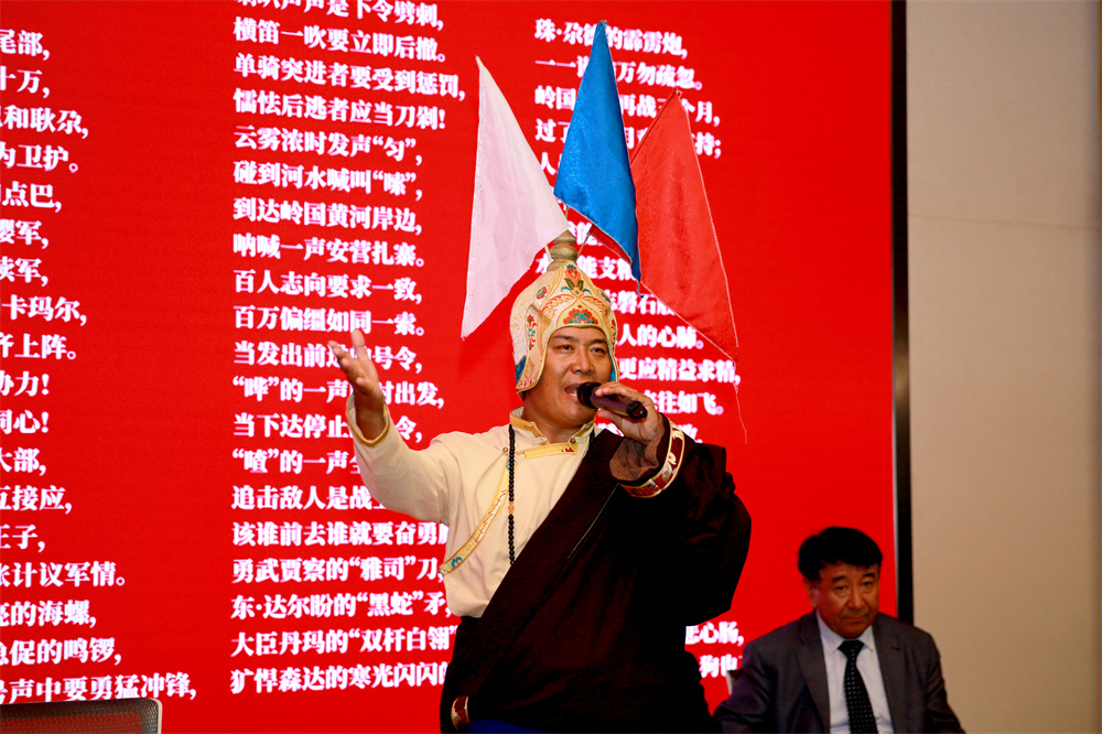 第三组展演是来自青海的2位仲肯带来的藏族史诗《格萨尔》表演和4位来自新疆的格斯尔奇集体演述的蒙古族史诗《格斯尔》片段—《格斯尔赞》。中国社科院民族文学研究所诺布旺丹研究员高度肯定了这次活动的意义。他指出,《格萨(斯)尔》在藏族、蒙古族和土族、裕固族、东乡族等十三个民族中都有流传,不同的译名便来源于不同流传地区的语言发音。随后,诺布旺丹研究员从《格萨(斯)尔》最早的起源历史谈起,清晰地梳理了史诗的形成脉络,并对史诗古老的口传特征、表演方式和神圣性等内容进行了简要分析。