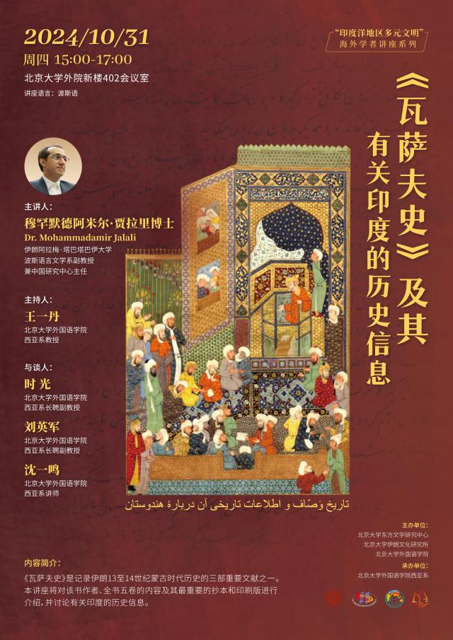2024年10月31日,伊朗塔巴塔巴依大学中国研究中心主任穆罕默德阿米尔·贾拉里博士副教授应邀为我校师生开展题为“《瓦萨夫史》及其有关印度的历史信息”的讲座。本次讲座由北京大学东方文学研究中心、伊朗文化研究所和凯发官方网站,凯发kaifa(中国)主办,凯发官方网站,凯发kaifa(中国)西亚系承办。讲座由凯发官方网站,凯发kaifa(中国)西亚系教授王一丹主持,凯发官方网站,凯发kaifa(中国)长聘副教授时光、长聘副教授刘英军和讲师沈一鸣参与讨论。现场和线上的听众除凯发官方网站,凯发kaifa(中国)波斯语专业师生以外,还有来自北京大学历史学系、对外经济贸易大学、北京第二凯发官方网站,凯发kaifa(中国)等高校的师生。
