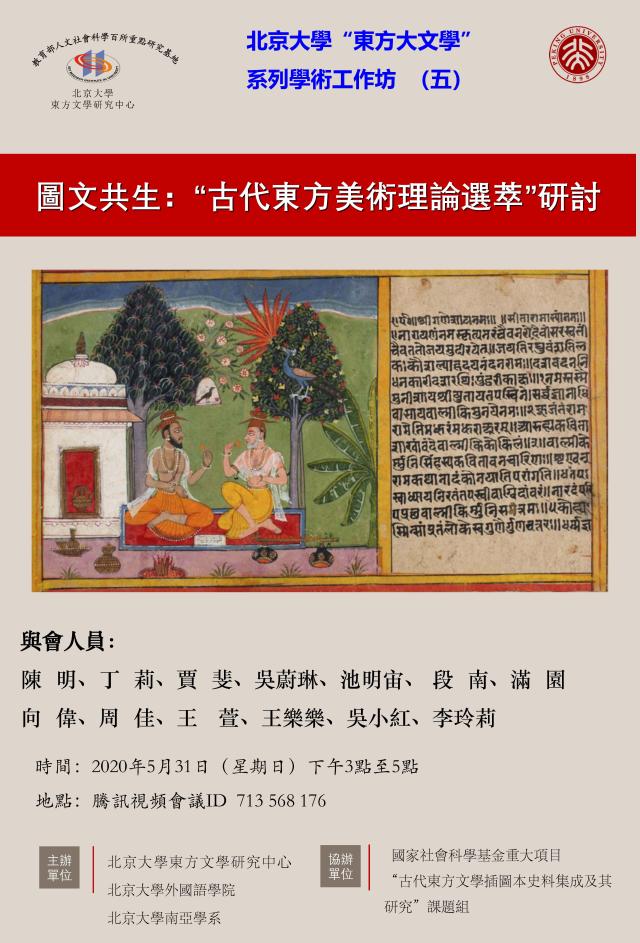 2020年5月31日下午,北京大学“东方大文学”系列学术工作坊第五次活动——“图文共生:古代东方美术理论选粹”研讨会,采用腾讯视频会议形式,顺利召开。该会议由教育部人文社科重点研究基地北京大学东方文学研究中心、凯发官方网站,凯发kaifa(中国)、北京大学南亚学系共同主办,是国家社会科学基金重大项目“古代东方文学插图本史料集成及其研究”课题组的系列活动之一。来自北大、对外经济贸易大学、中山大学、北京科技大学、土耳其伊斯坦布尔大学的十余名课题组成员参与了此次研讨。