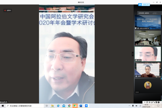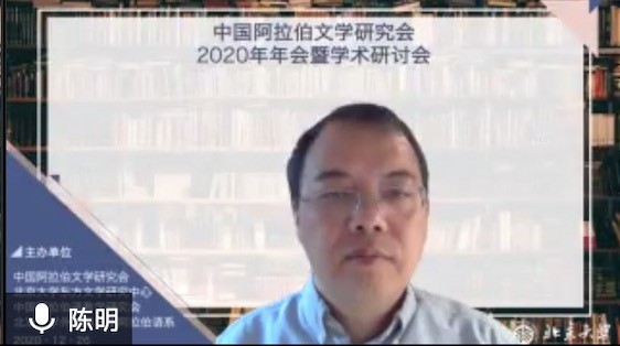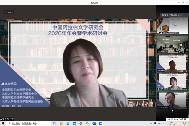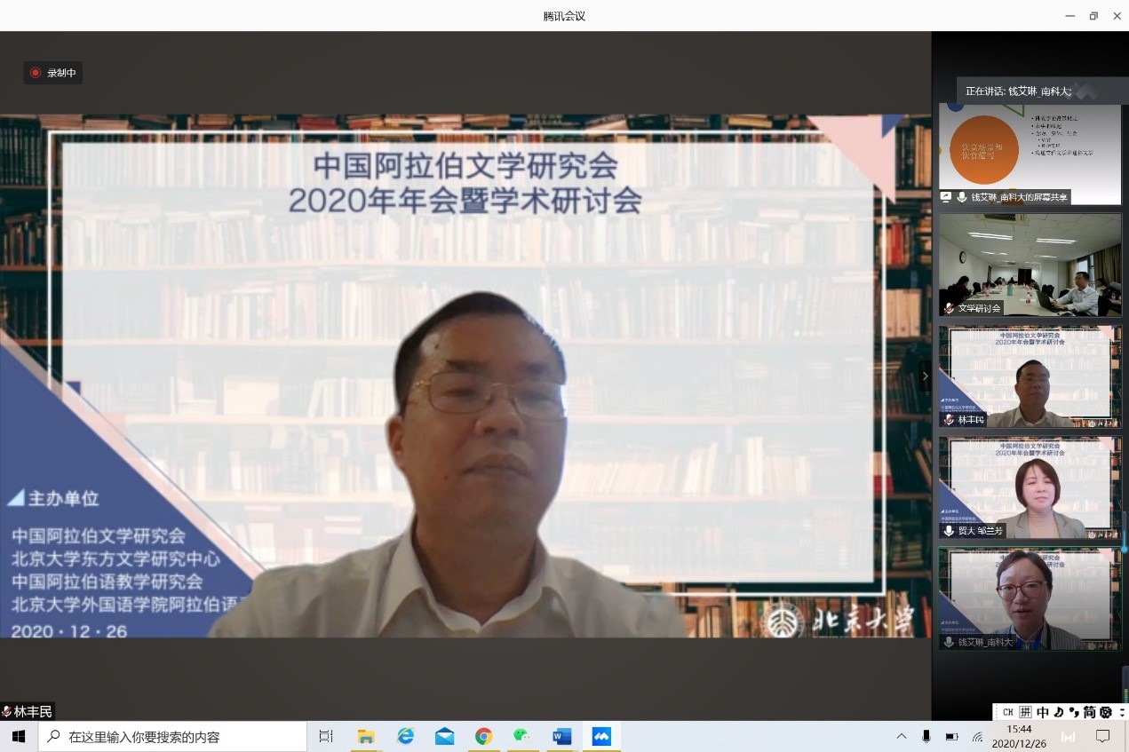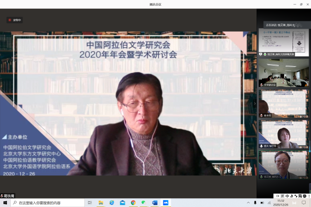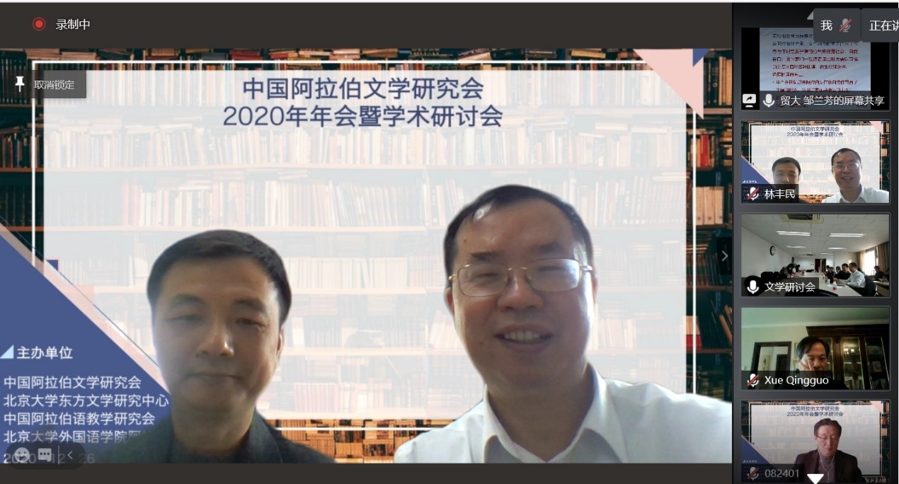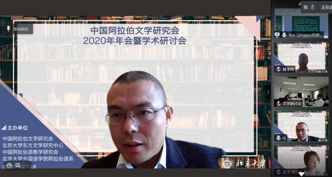2020年12月26日,由中国外国文学学会阿拉伯文学研究分会、凯发官方网站,凯发kaifa(中国)阿拉伯语系和北京大学东方文学研究中心联合举办的“中国外国文学学会阿拉伯文学研究分会2020年会暨学术研讨会”以线上线下混合的方式召开。本次会议共有来自北京大学、中山大学、对外经济贸易大学、宁夏大学、北京外国语大学、上海外国语大学、北京语言大学、南方科技大学、西北民族大学、西北师范大学、索邦大学文学院(巴黎四大)、威廉•玛丽大学、埃及亚历山大大学、马来西亚苏丹阿都哈林姆阿占沙国际伊斯兰大学和中国社会科学院外国文学研究所等高校和研究机构的100多人参加。开幕式由研究分会副会长、北京外国语大学谢赫扎耶德研究中心主任薛庆国教授主持。