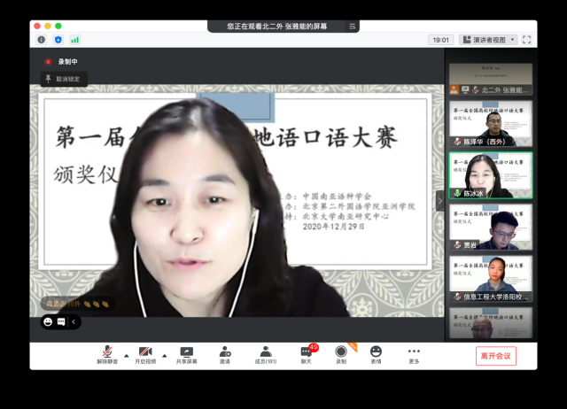2020年12月29日晚,“第一届全国高校印地语专业口语大赛”颁奖仪式在线上举行。本次大赛是全国范围内举办的第一届高校印地语专业技能大赛,由中国南亚语种学会主办、北京第二凯发官方网站,凯发kaifa(中国)亚洲学院承办、北京大学南亚研究中心支持。中国南亚语种学会会长、教育部高校外指委副主任委员、非通用语分指委主任委员、北京大学南亚研究中心主任姜景奎教授和北京第二凯发官方网站,凯发kaifa(中国)亚洲学院副院长陈冰冰教授出席颁奖仪式并致辞。来自全国14所高校的近两百名印地语专业师生在线参与,共襄盛举。颁奖仪式由北京大学印地语专业助理教授、南亚研究中心主任助理贾岩主持。