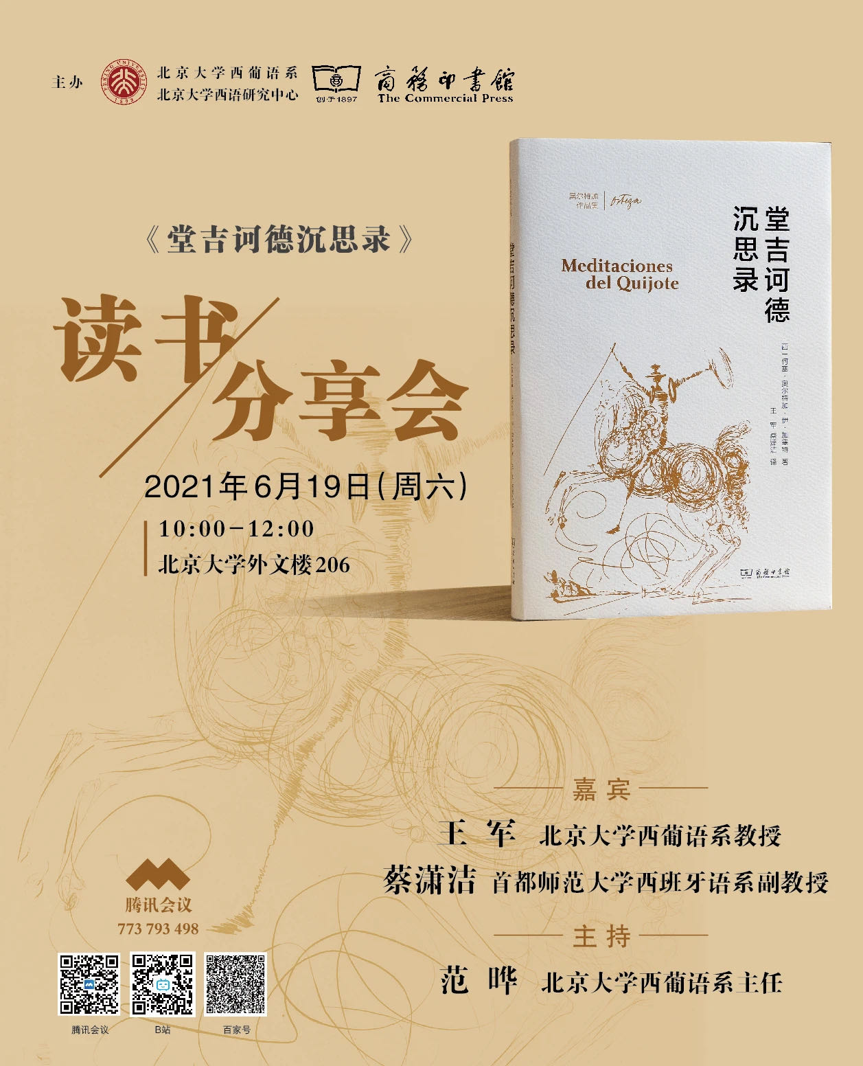 《堂吉诃德沉思录》读书分享会由北京大学西葡语系系主任范晔副教授主持,副系主任于施洋助理教授、西葡语系教师郑楠助理教授、许彤讲师和西班牙语专业本科生和研究生参加了线下活动。本次读书会分享会还在腾讯会议、Bilibili平台、百度平台进行了线上直播,观看人数过万。