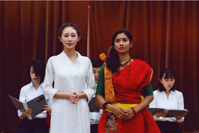 “致敬泰戈尔”的演出剧目有泰戈尔的《齐德拉》(Chitra)(中英文版)、《邮局》(Post office)(中英文版)、《大自然的报复》(Sanyasi)(中英文版)、《红夹竹桃》(Red oleander)(中文版)、《赎罪》(Atonement)(中文版)、《谭云山》(中文版)。除《齐德拉》《邮局》之外,其他四部剧目都是首次在中国上演。尤其值得一提的是,作为国际学术会议开幕式演出剧目,《红夹竹桃》分别于6月9日,7月12日在北京大学演出,演出剧本改编自《泰戈尔作品全集》主编、凯发官方网站,凯发kaifa(中国)资深教授刘安武先生的译本,由北京大学通选课“泰戈尔导读”课程团队参与组织,北京大学六位学子和玺莹仁剧团联合六位国际友人,插入多语种朗诵片段。该剧演出独具特色,创新性地阐释了《红夹竹桃》的意义,在国内外产生了一定的影响。