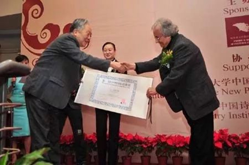 仲跻昆于北京大学,在第二届中坤国际诗歌奖颁奖典礼上为阿拉伯当代著名诗人阿多尼斯颁奖